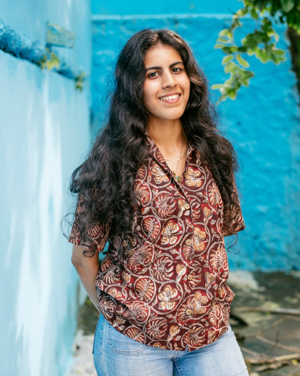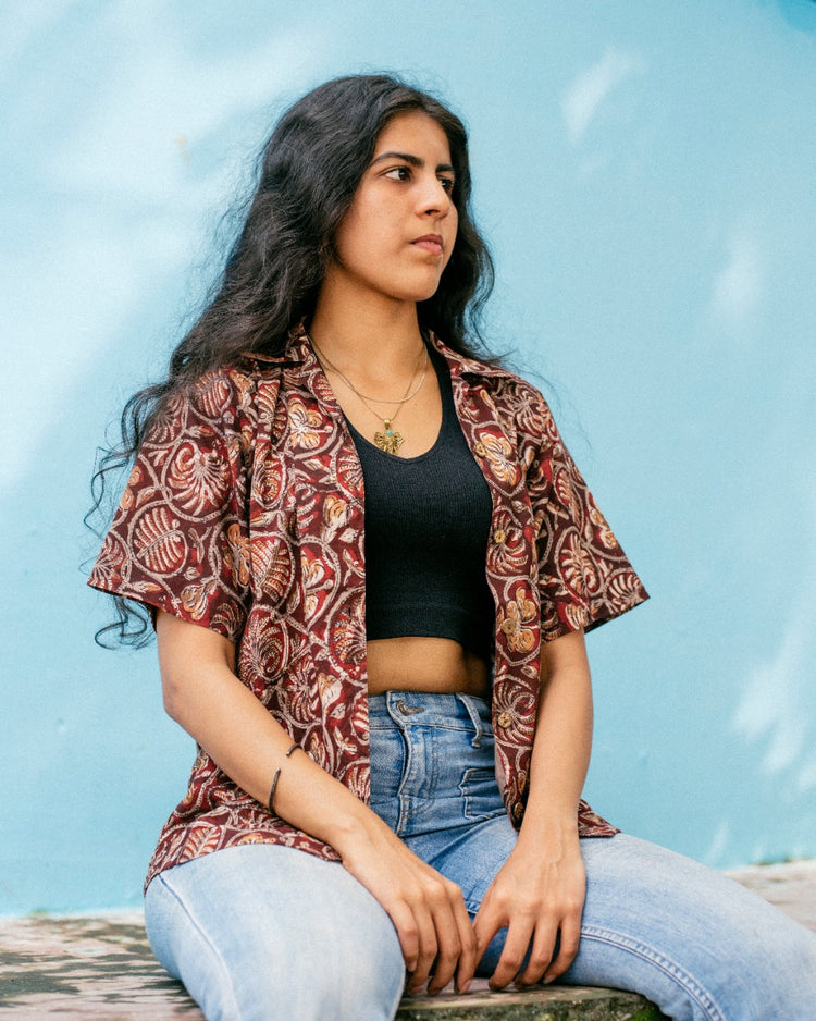 Ajrakh, an indigenous textile from India's western states, features geometric designs and patterns block printed by stamps. The procedure uses vegetables and other natural dyes to represent the history and legacy of India's historic artisan community.
