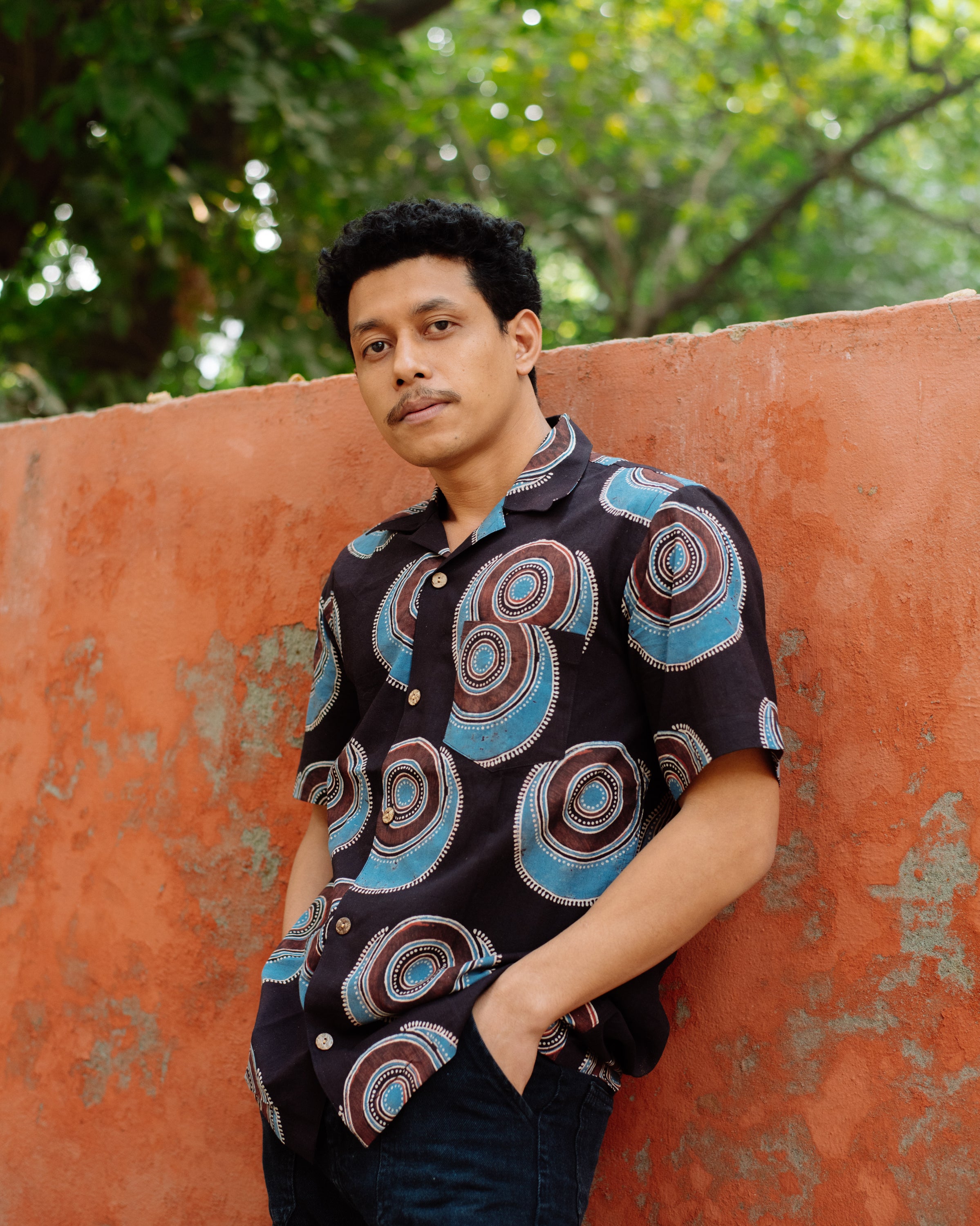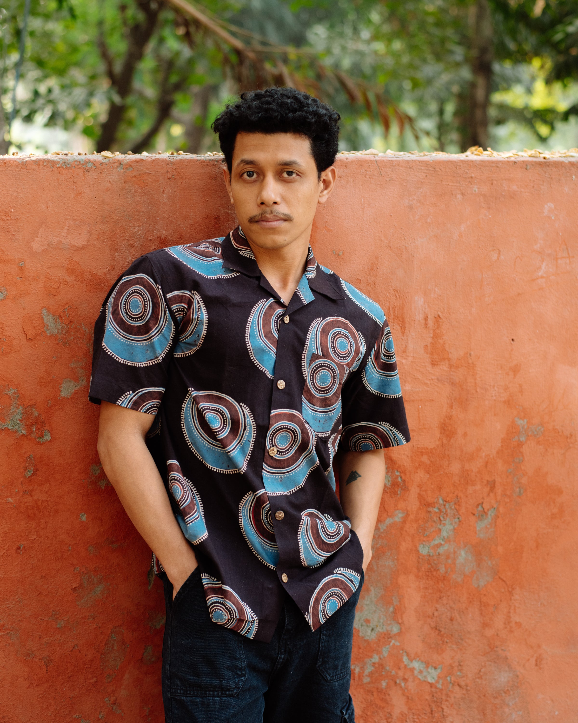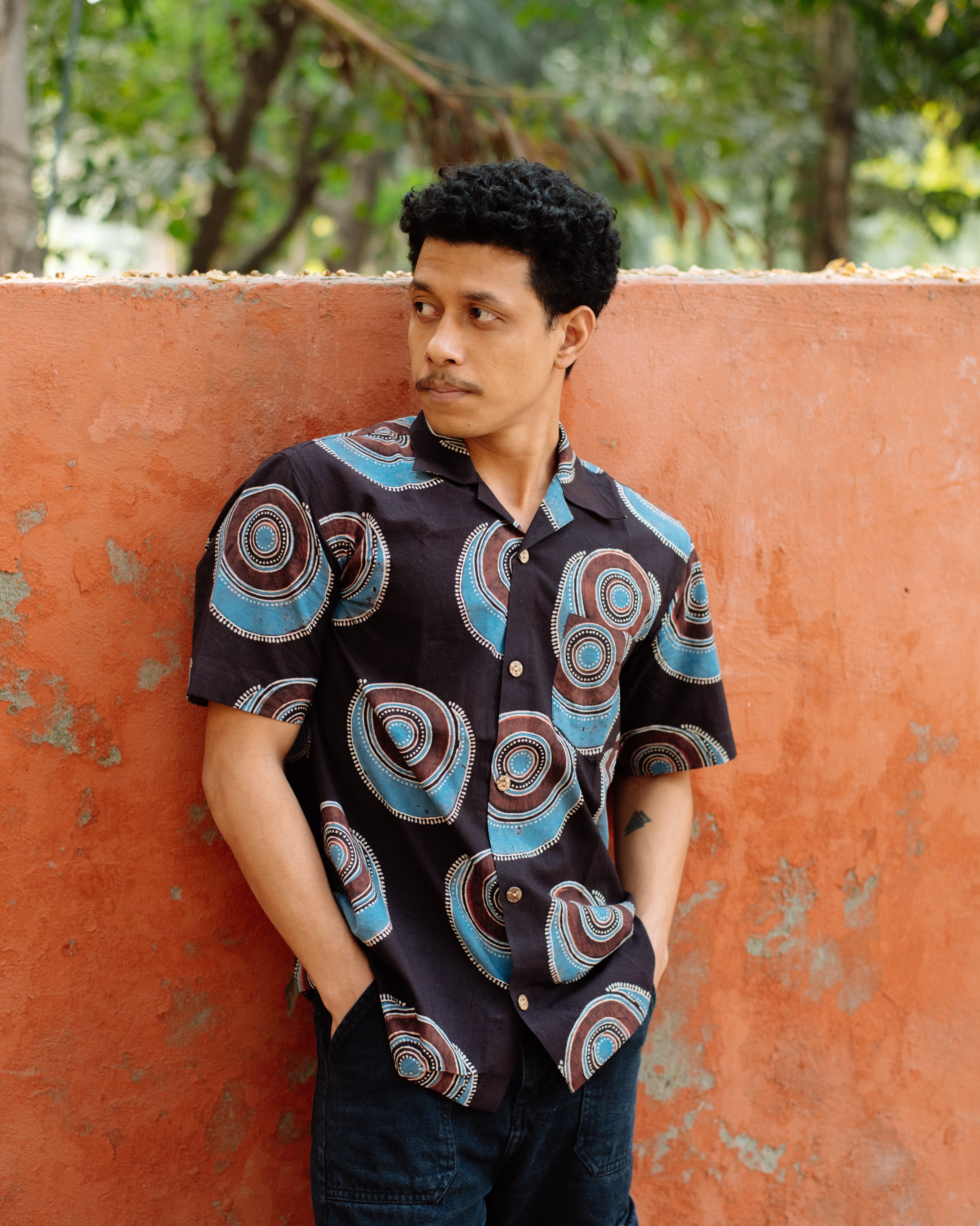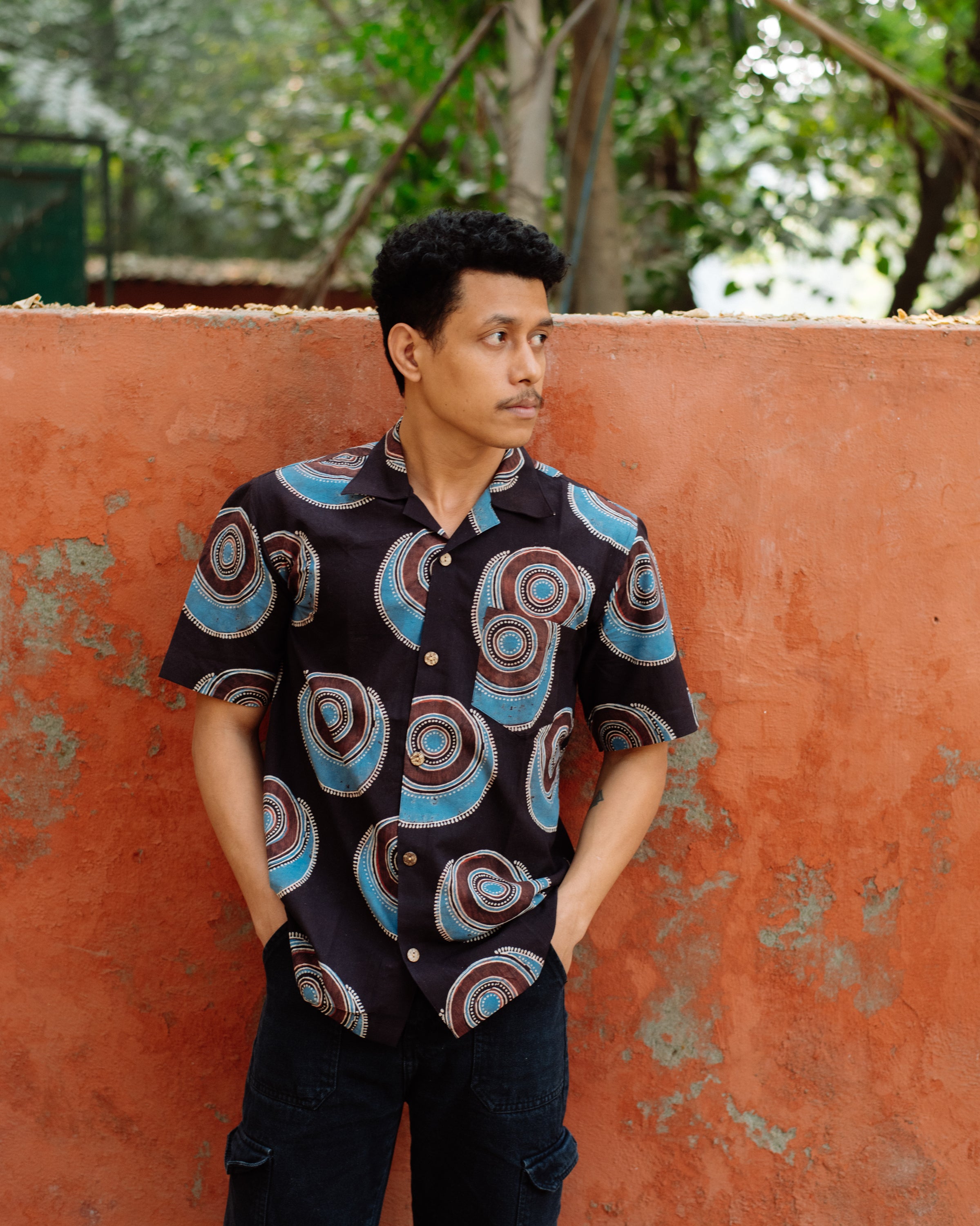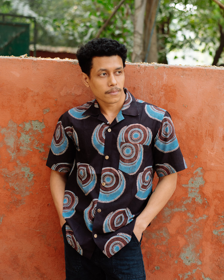 Ajrakh, an indigenous textile from India's western states, features geometric designs and patterns block printed by stamps. The procedure uses vegetables and other natural dyes to represent the history and legacy of India's historic artisan community.
