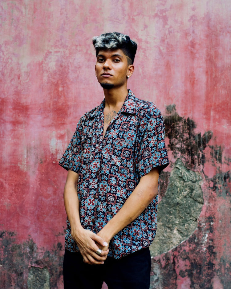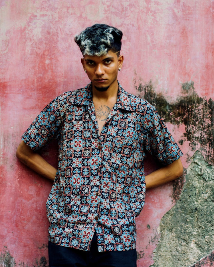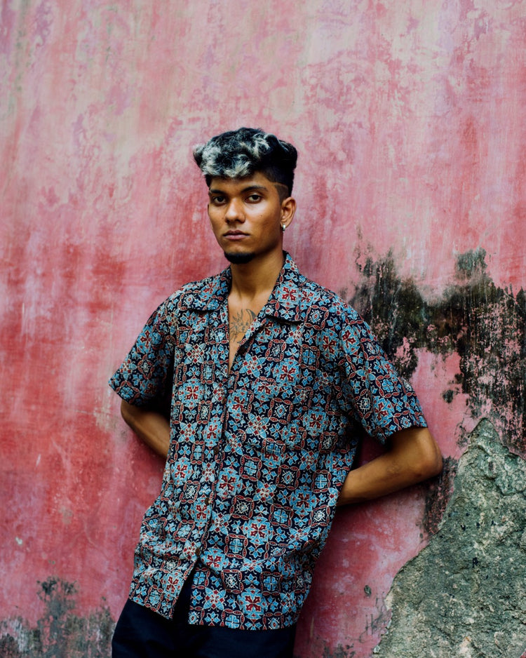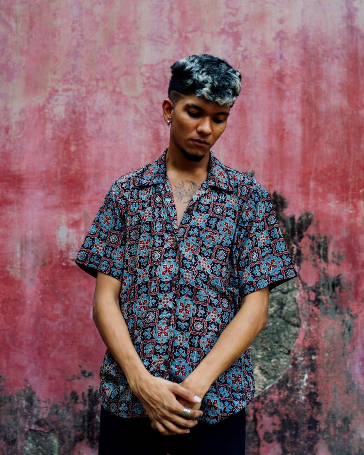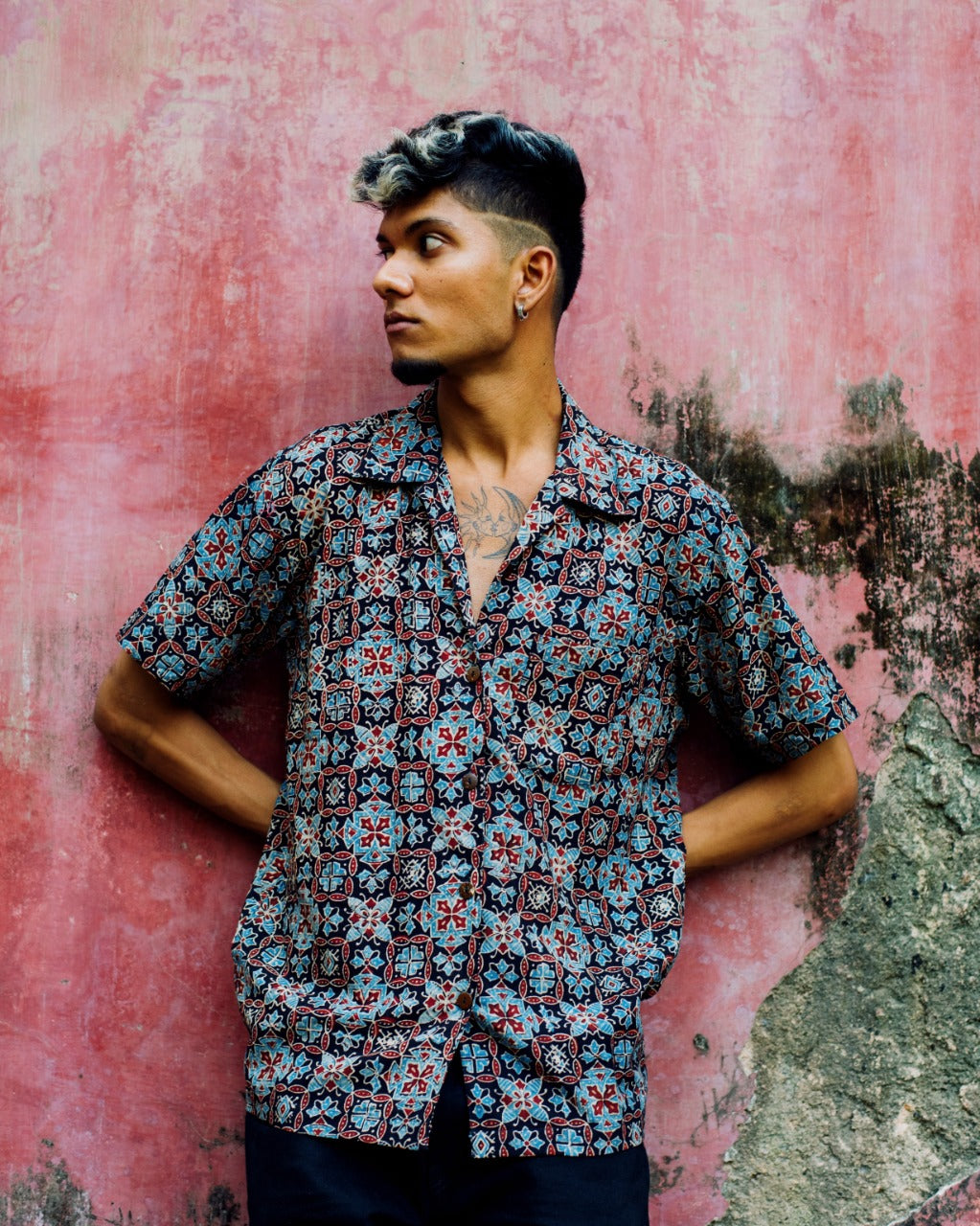 Ajrakh, an indigenous textile from India's western states, features geometric designs and patterns block printed by stamps. The procedure uses vegetables and other natural dyes to represent the history and legacy of India's historic artisan community.