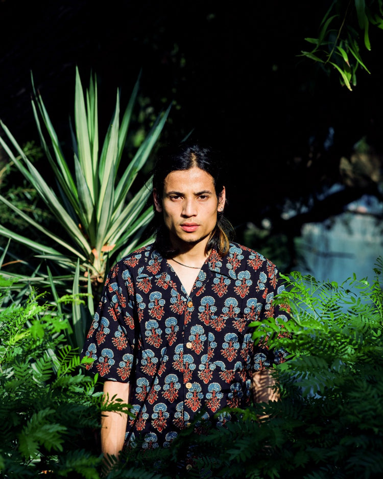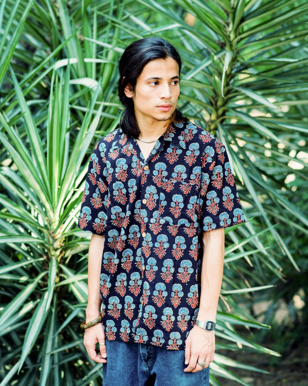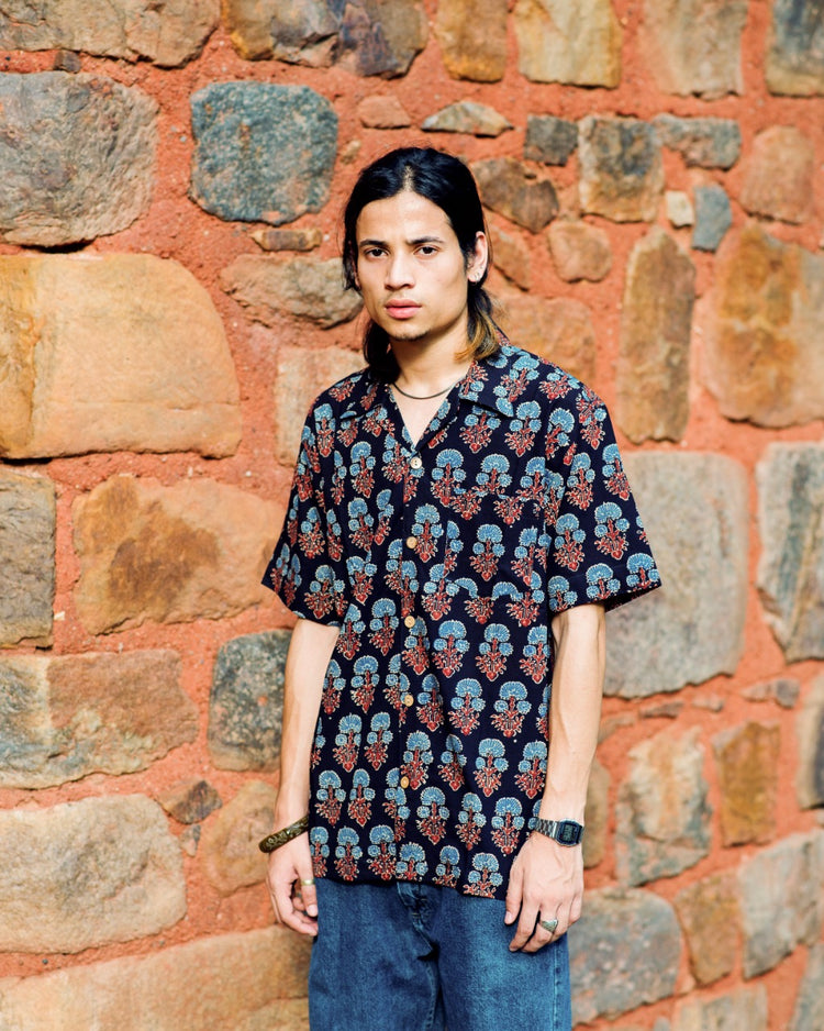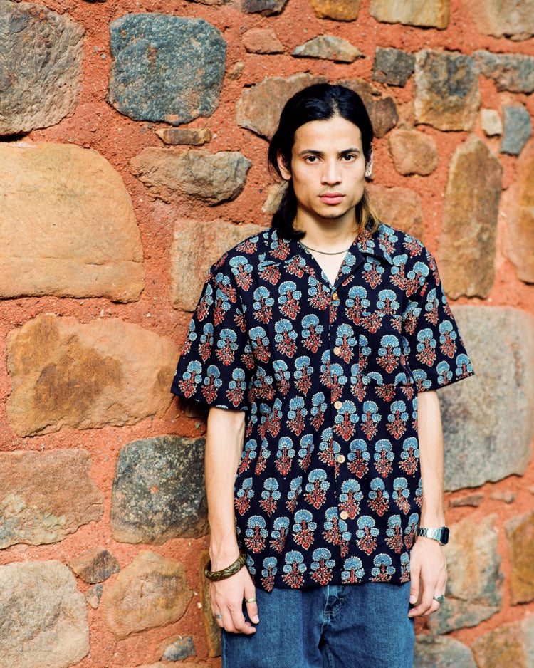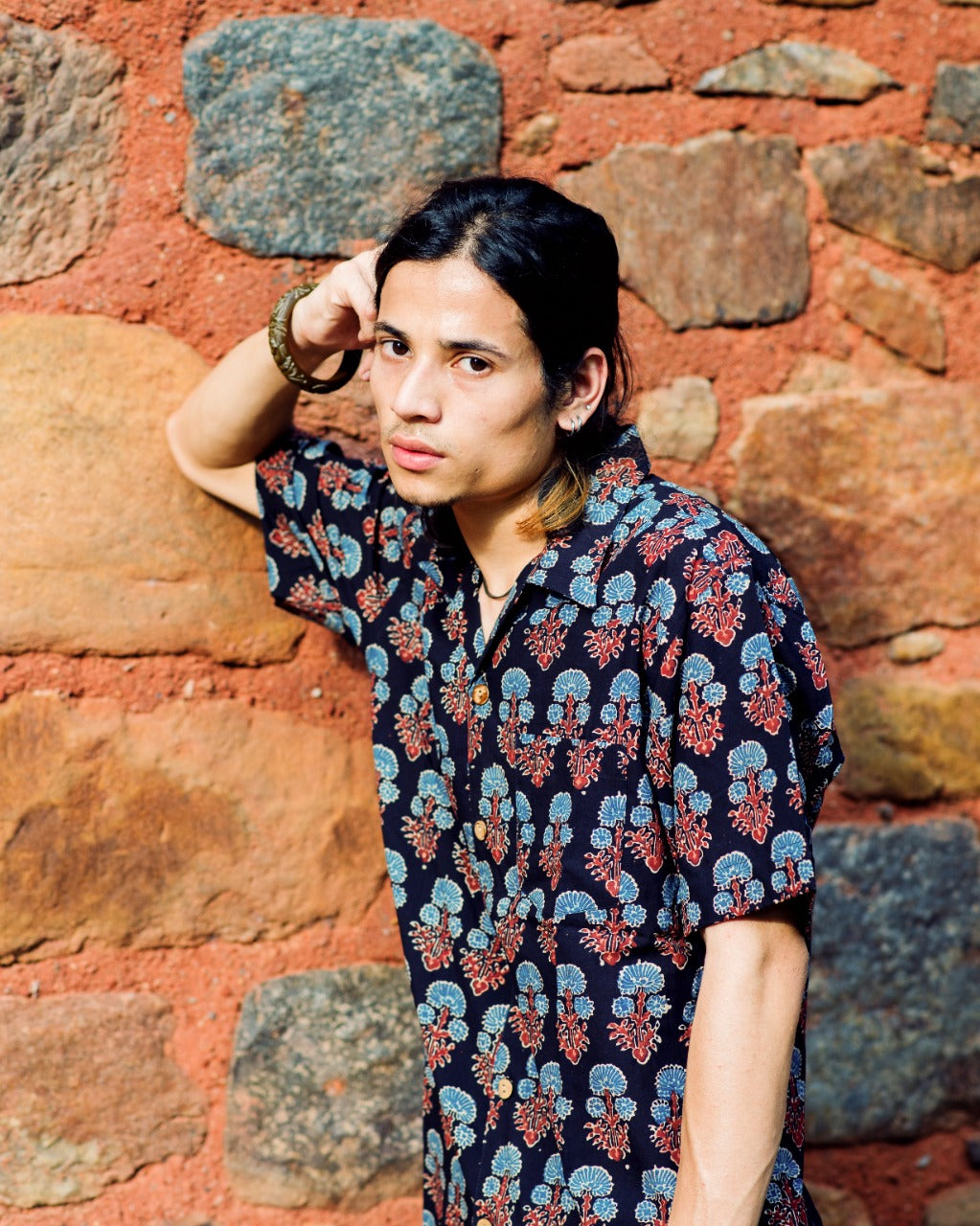 Ajrakh, an indigenous textile from India's western states, features geometric designs and patterns block printed by stamps. The procedure uses vegetables and other natural dyes to represent the history and legacy of India's historic artisan community.