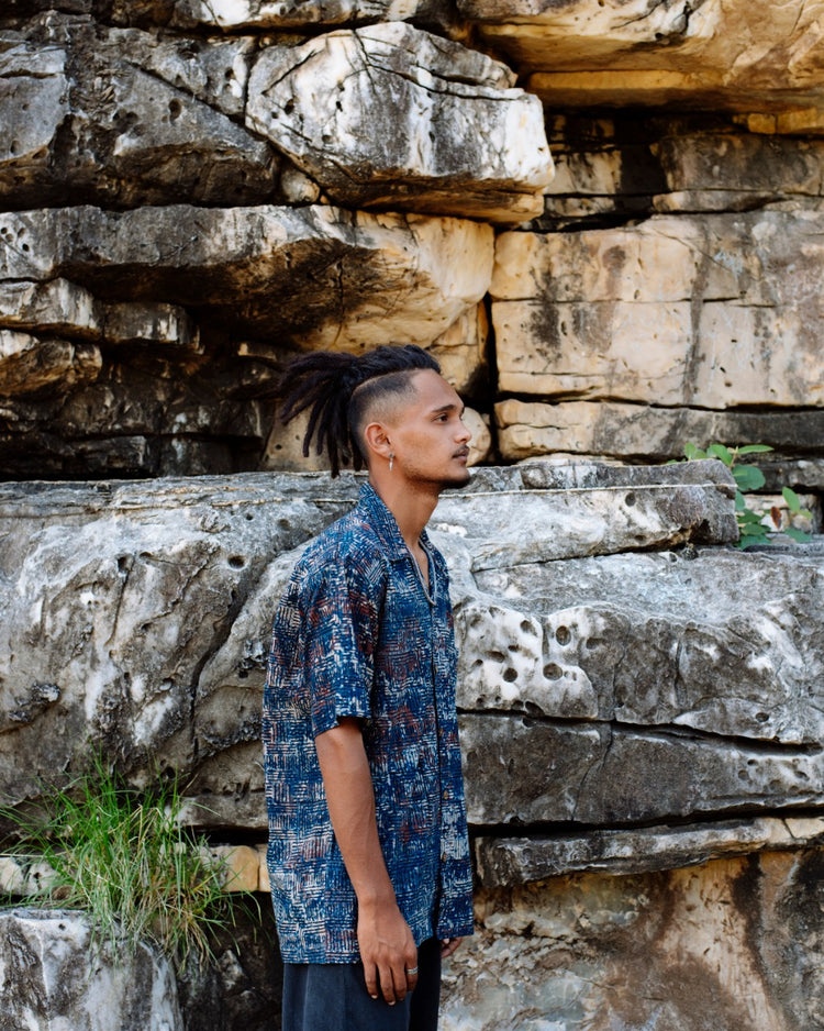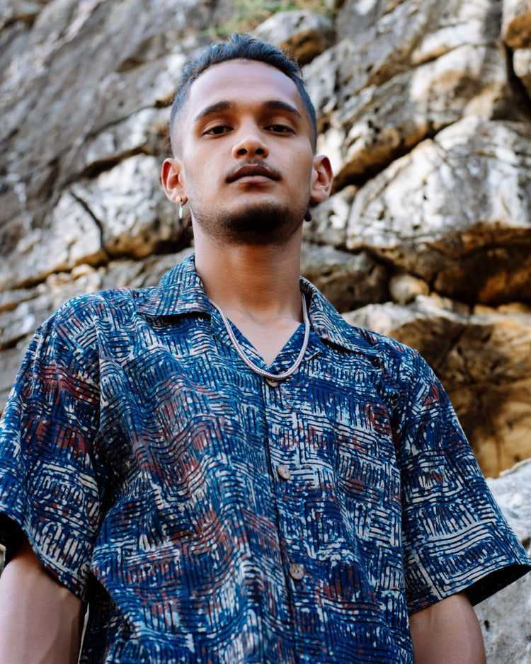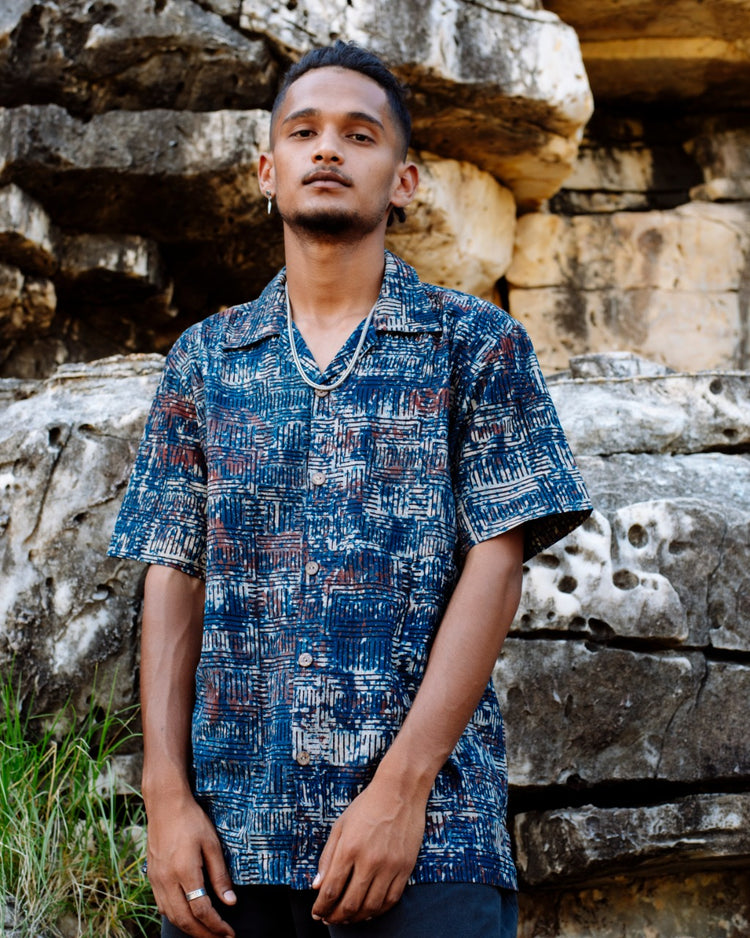 Ajrakh, an indigenous textile from India's western states, features geometric designs and patterns block printed by stamps. The procedure uses vegetables and other natural dyes to represent the history and legacy of India's historic artisan community.