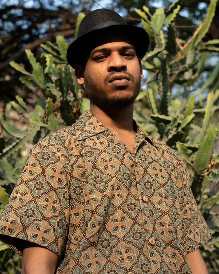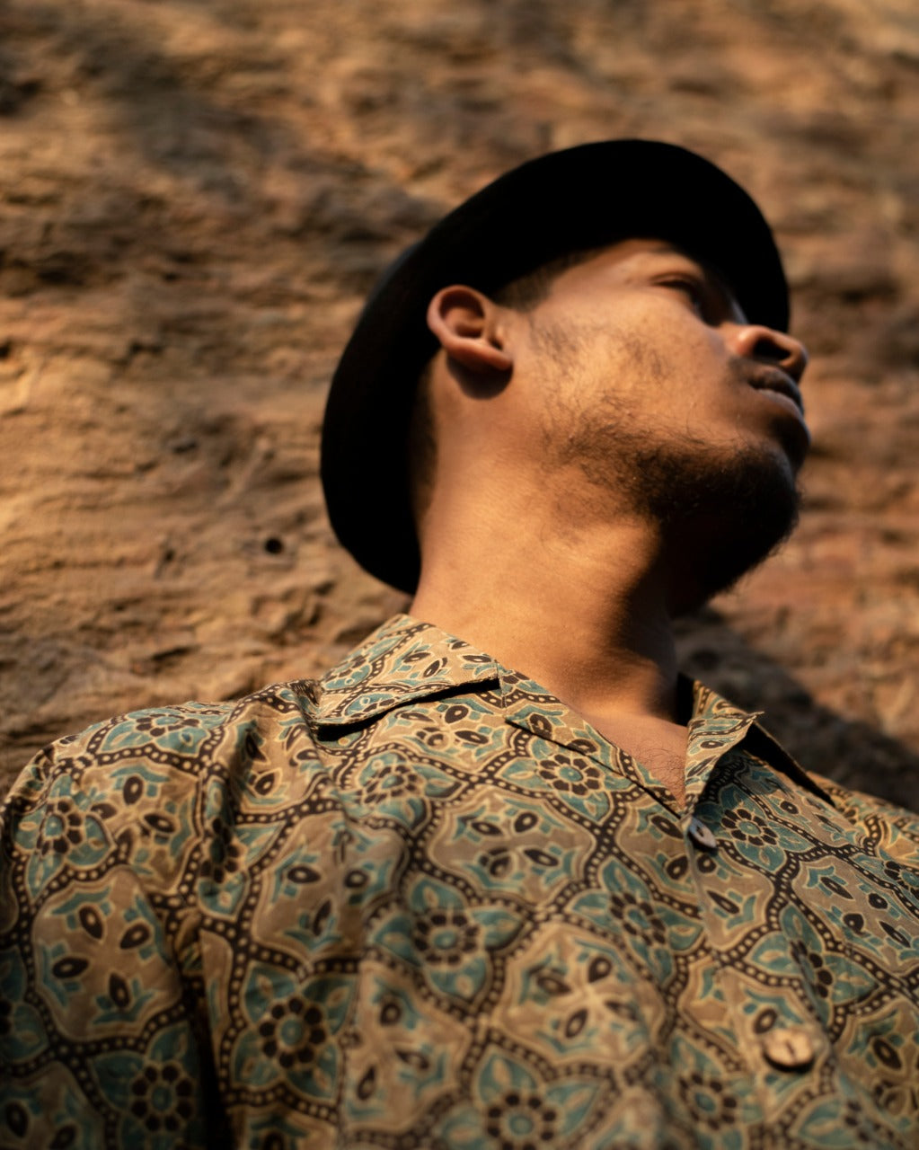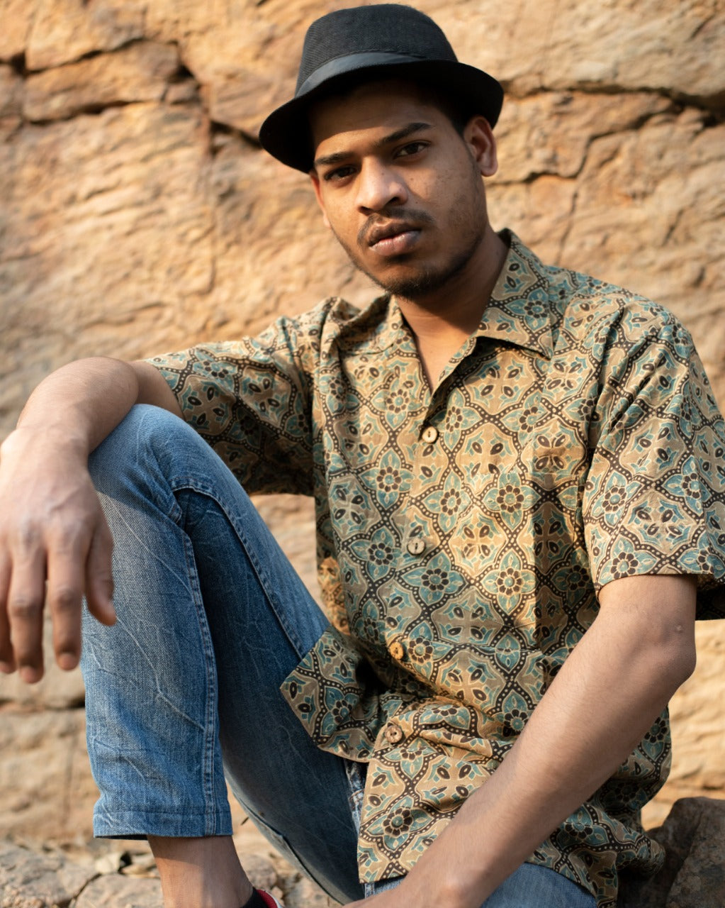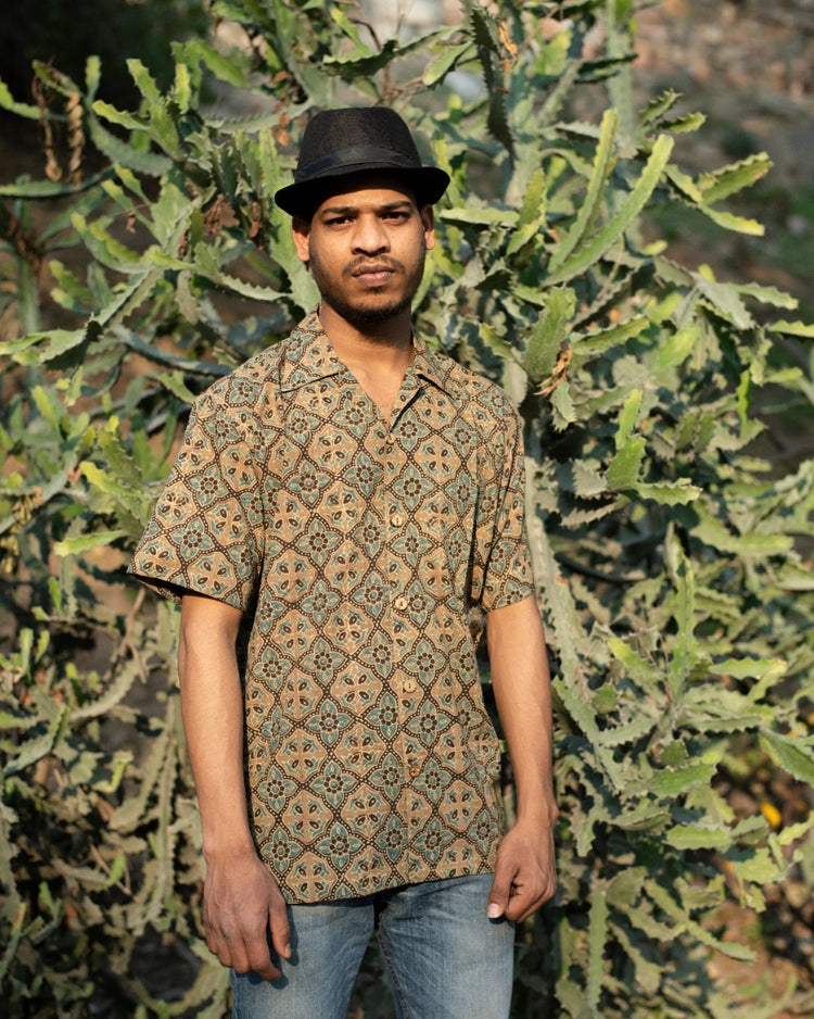 Ajrakh, an indigenous textile from India's western states, features geometric designs and patterns block printed by stamps. The procedure uses vegetables and other natural dyes to represent the history and legacy of India's historic artisan community.
