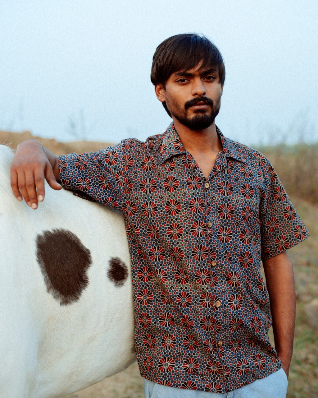Ajrakh, an indigenous textile from India's western states, features geometric designs and patterns block printed by stamps. The procedure uses vegetables and other natural dyes to represent the history and legacy of India's historic artisan community.