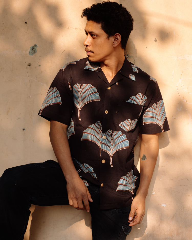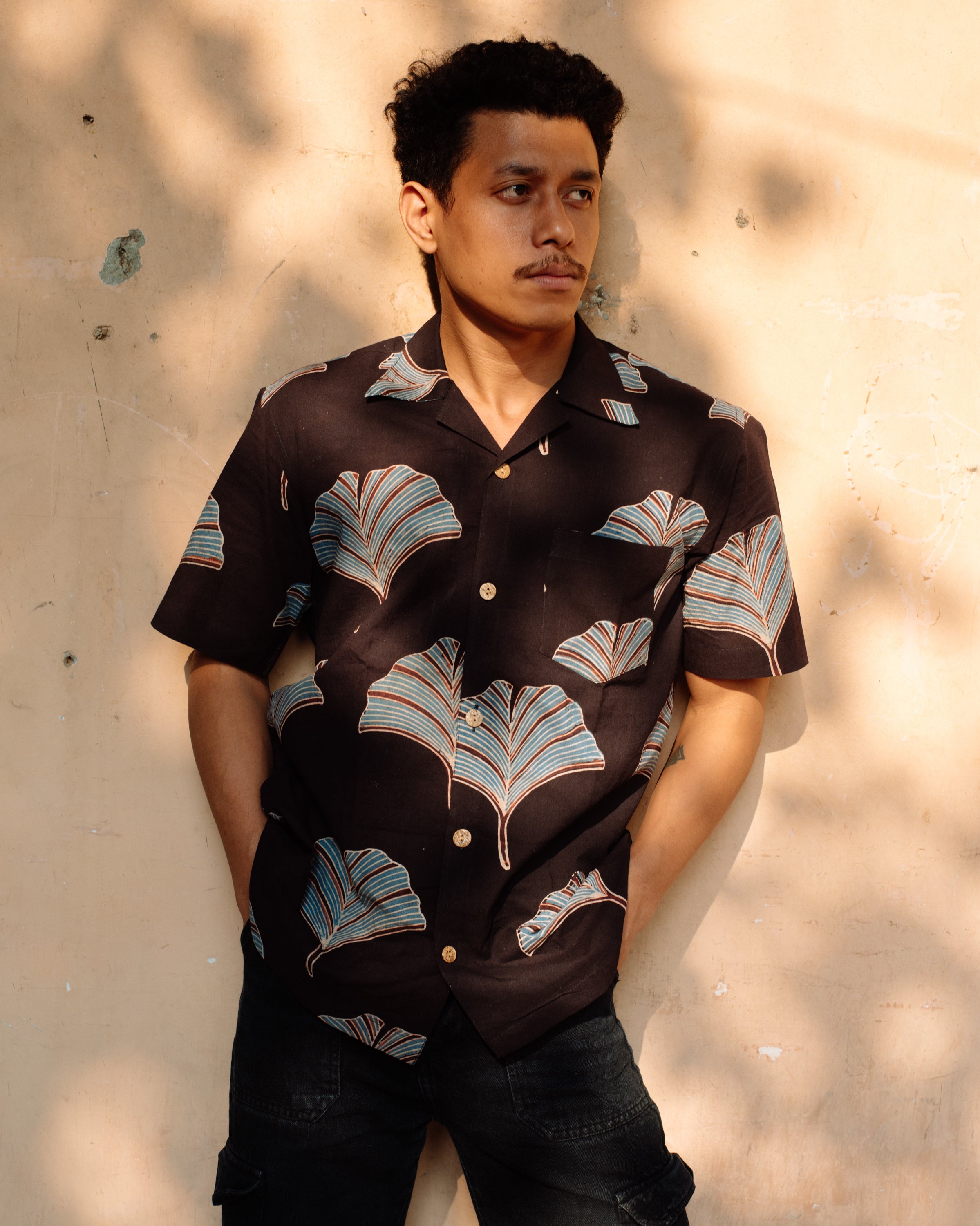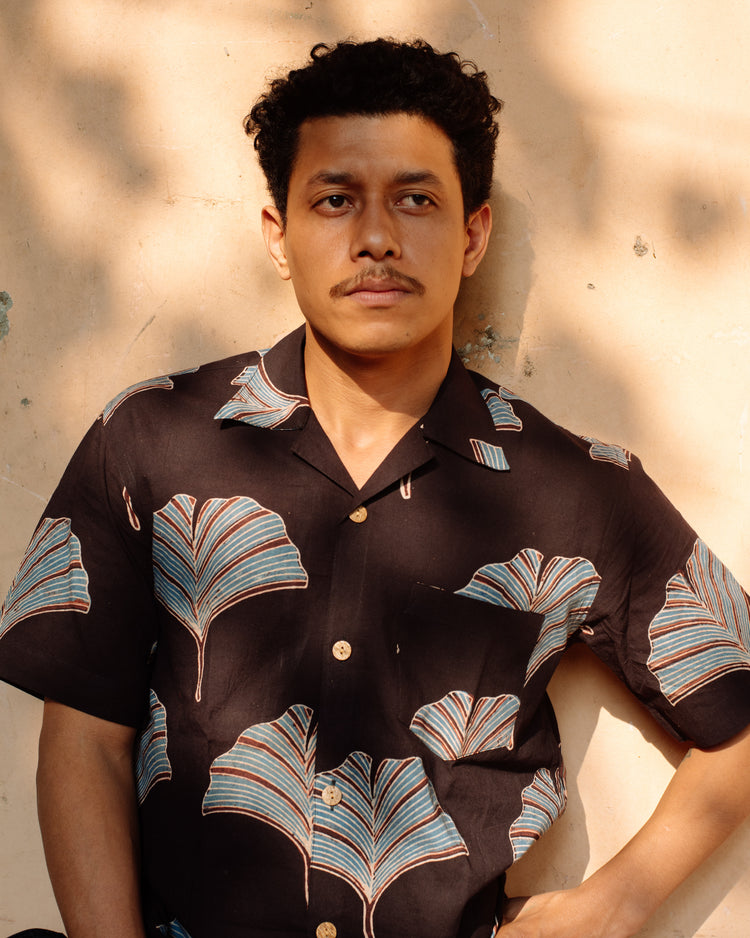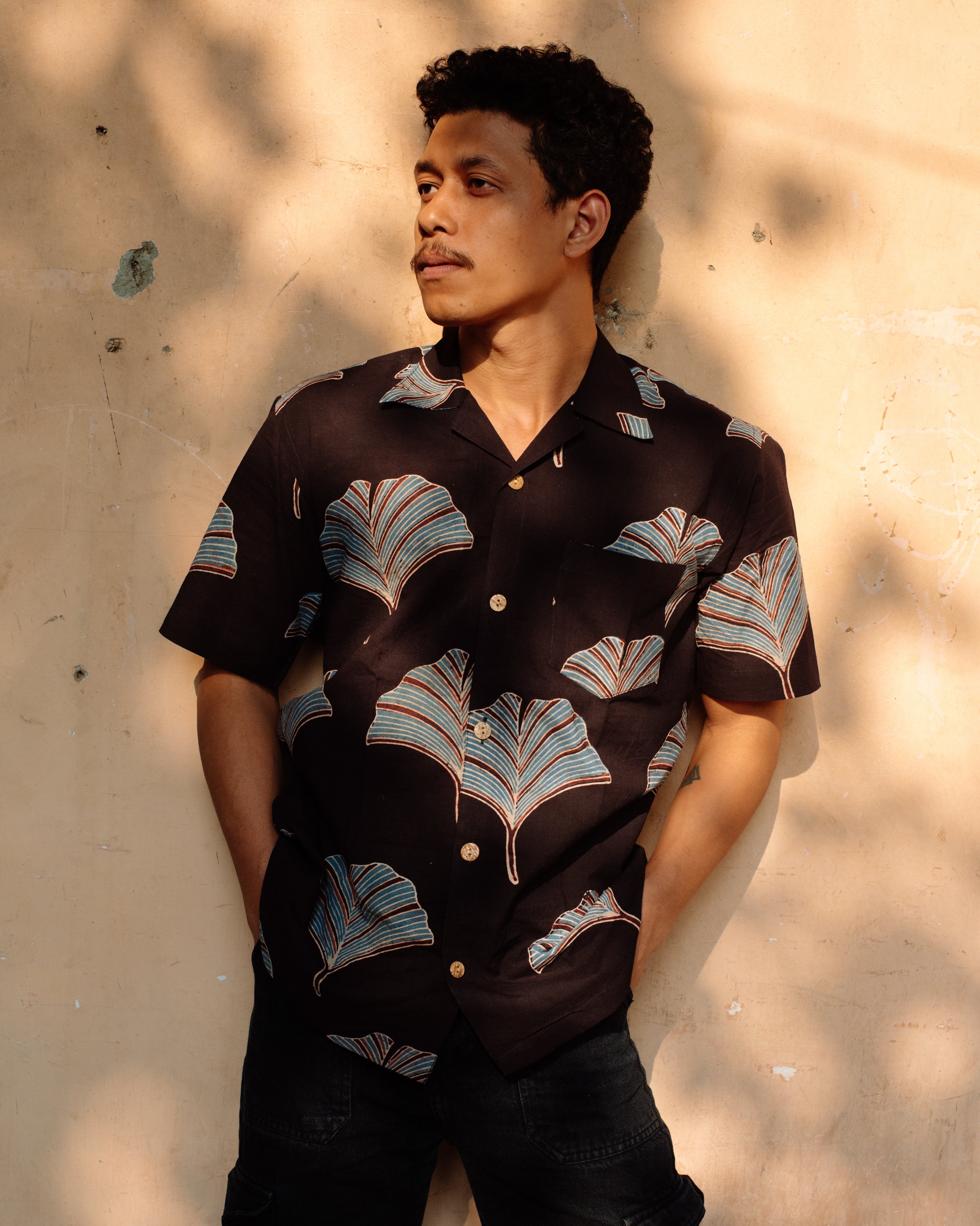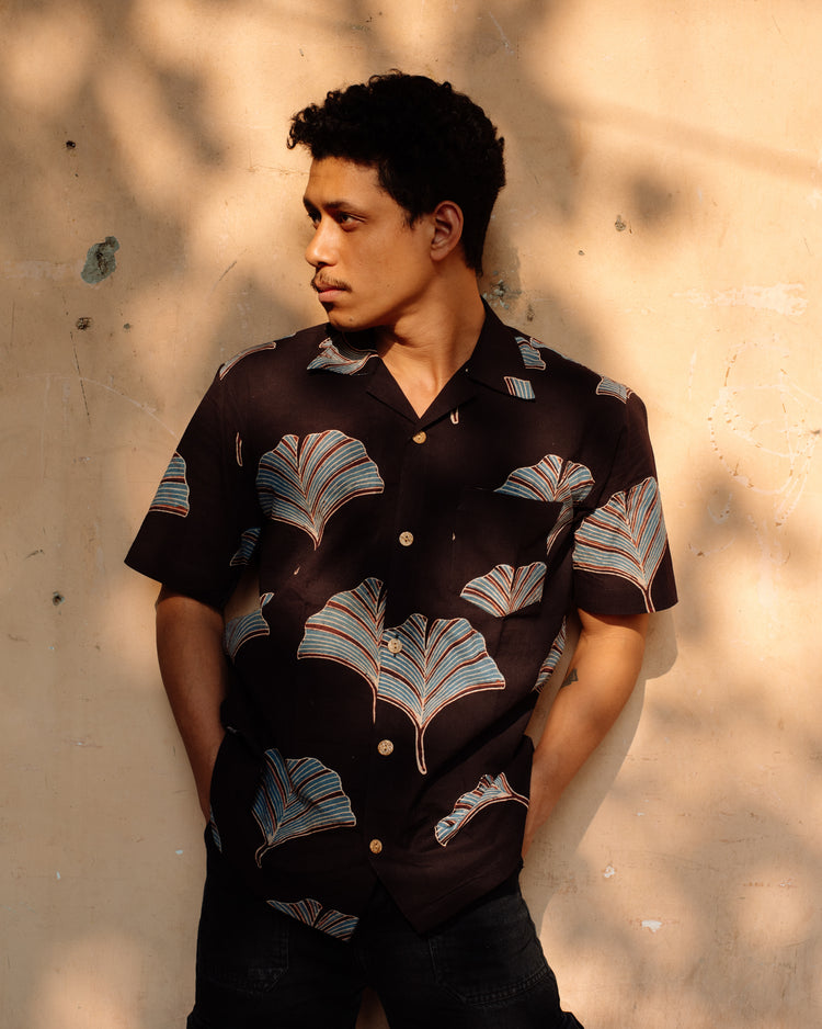 Ajrakh, an indigenous textile from India's western states, features geometric designs and patterns block printed by stamps. The procedure uses vegetables and other natural dyes to represent the history and legacy of India's historic artisan community.