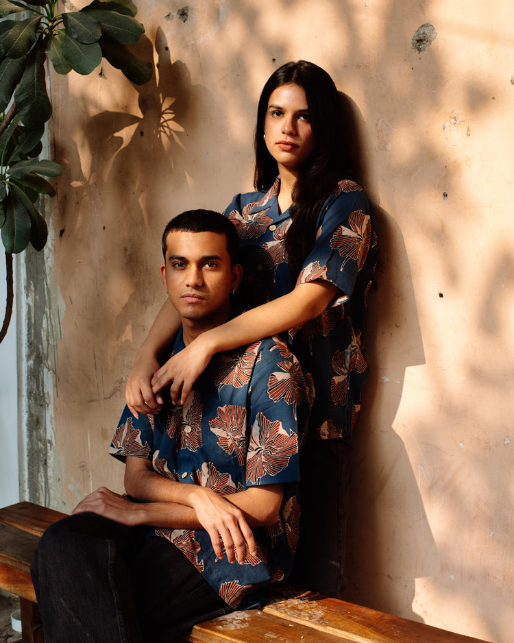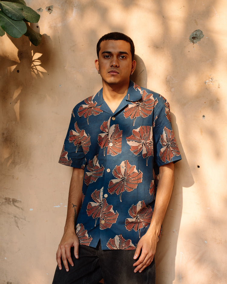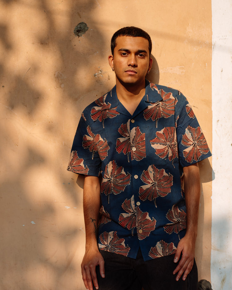 Ajrakh, an indigenous textile from India's western states, features geometric designs and patterns block printed by stamps. The procedure uses vegetables and other natural dyes to represent the history and legacy of India's historic artisan community.
