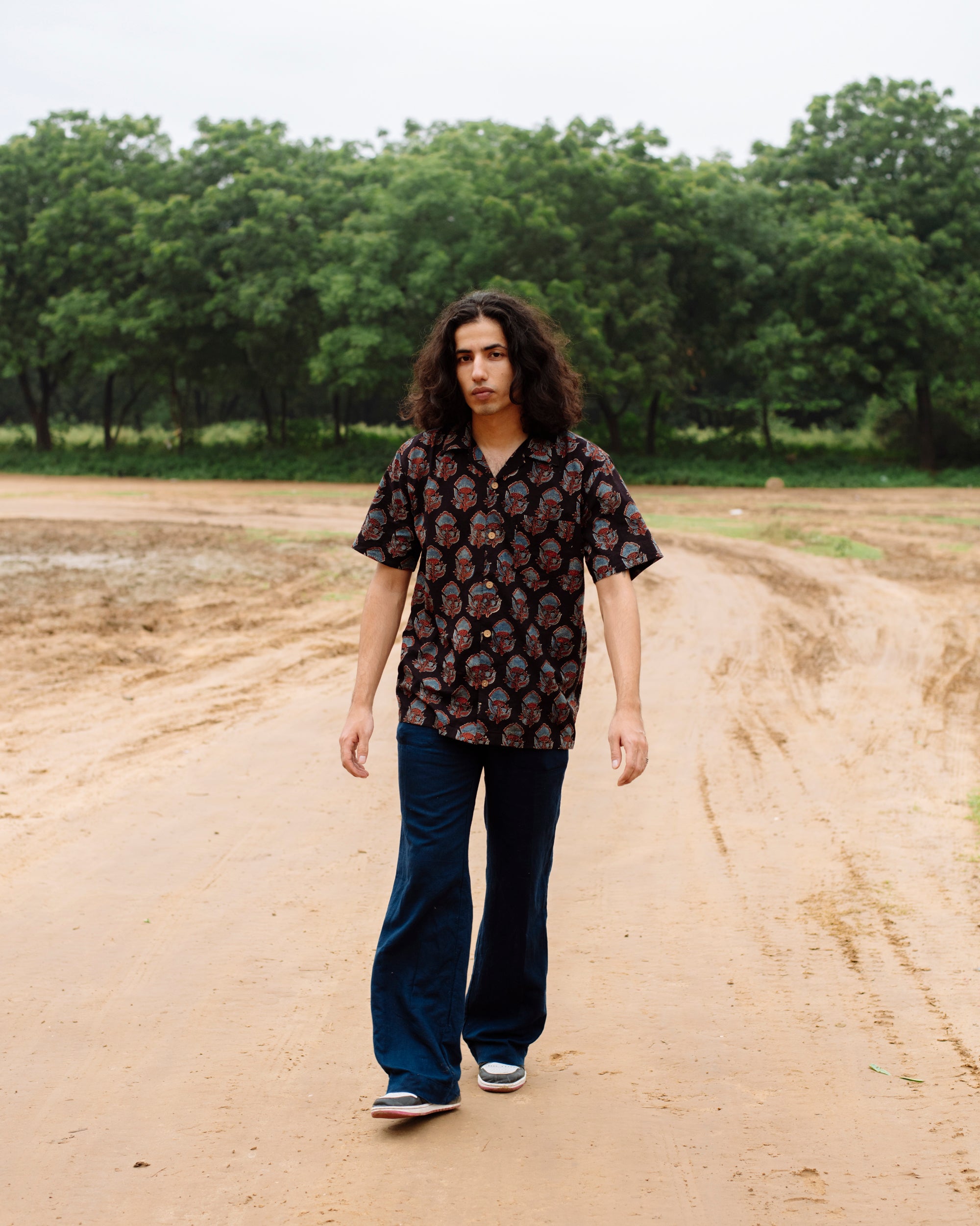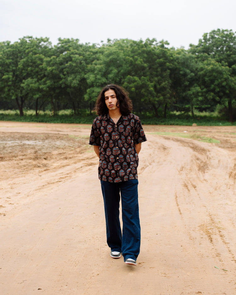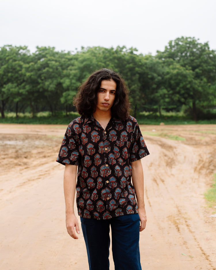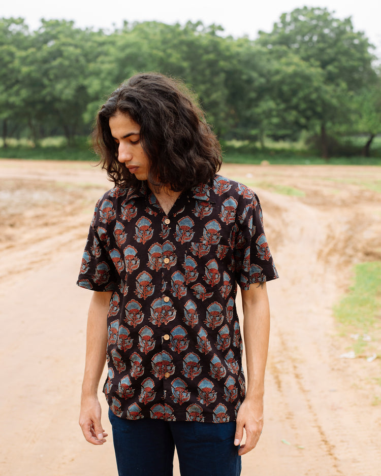 Ajrakh, an indigenous textile from India's western states, features geometric designs and patterns block printed by stamps. The procedure uses vegetables and other natural dyes to represent the history and legacy of India's historic artisan community.