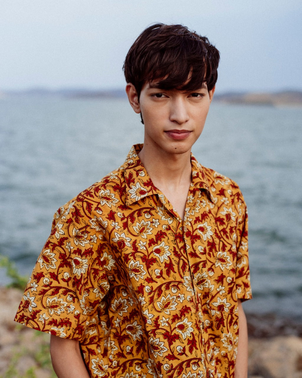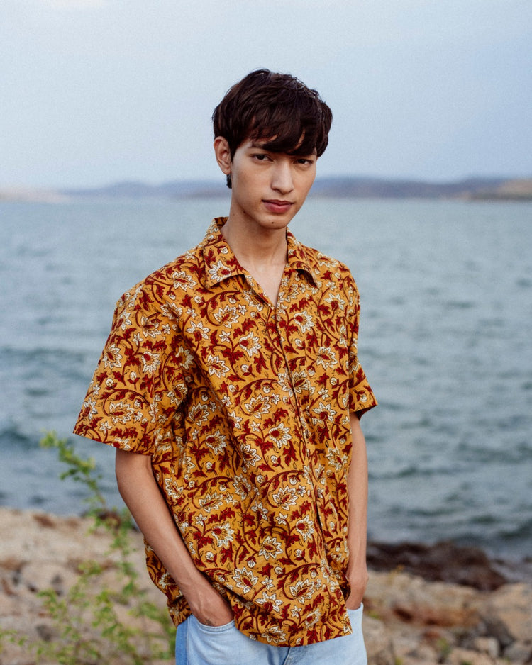 Ajrakh, an indigenous textile from India's western states, features geometric designs and patterns block printed by stamps. The procedure uses vegetables and other natural dyes to represent the history and legacy of India's historic artisan community.