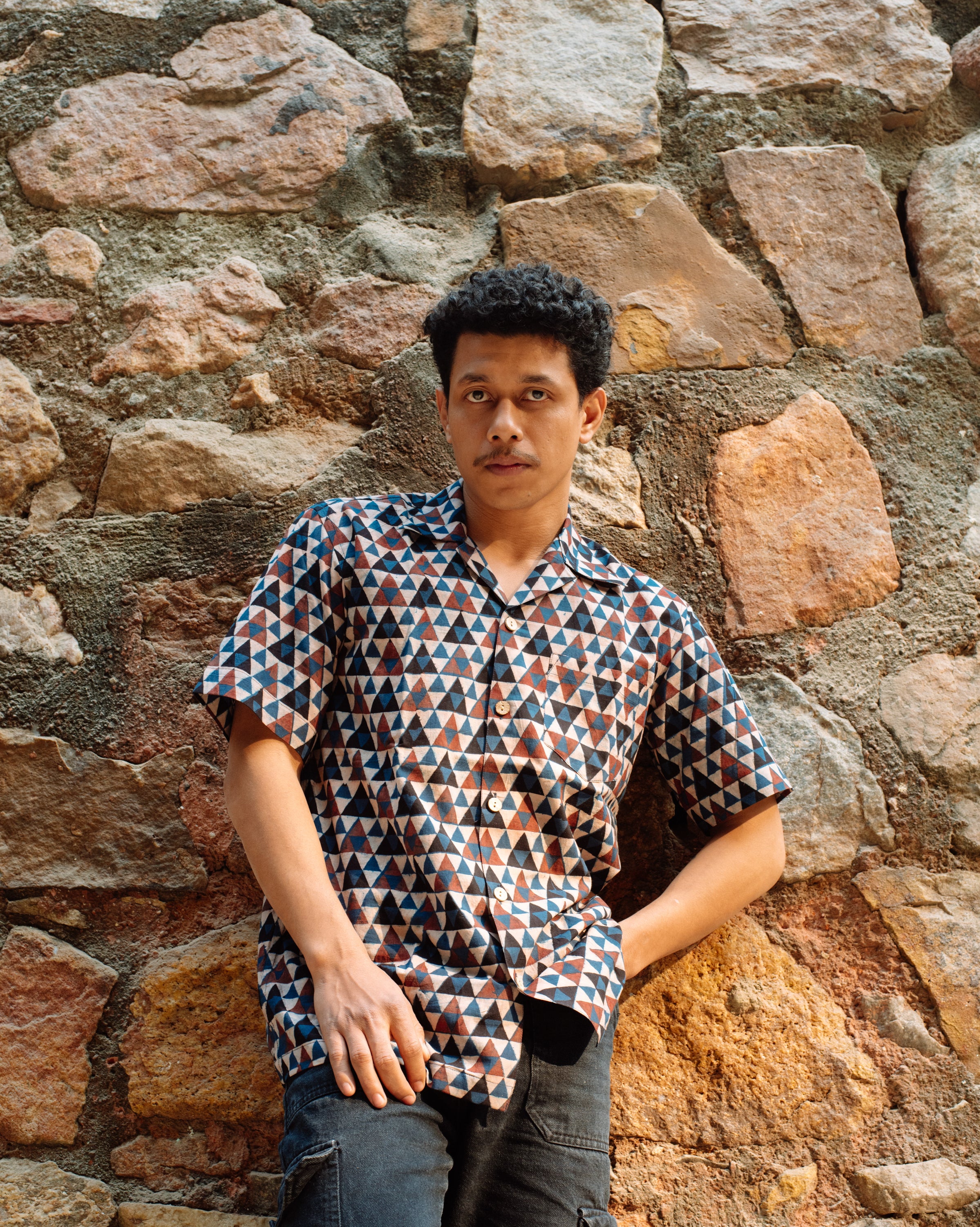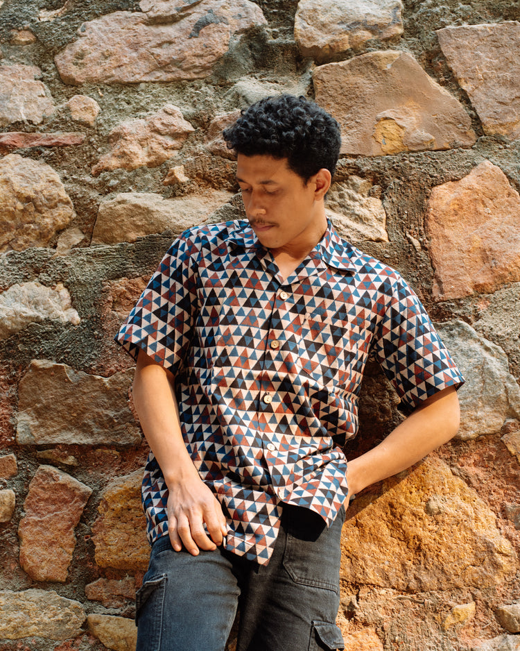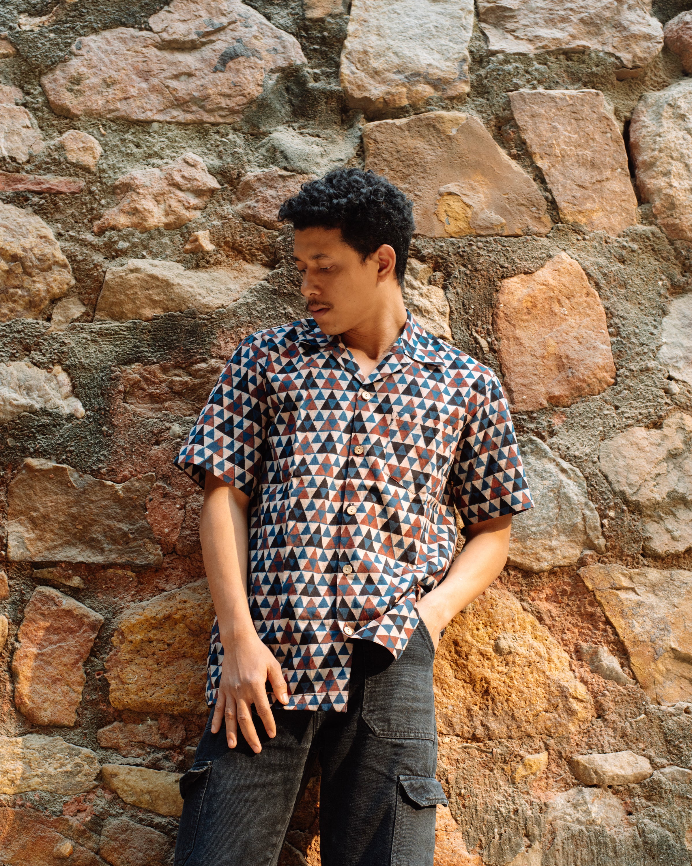 Ajrakh, an indigenous textile from India's western states, features geometric designs and patterns block printed by stamps. The procedure uses vegetables and other natural dyes to represent the history and legacy of India's historic artisan community.