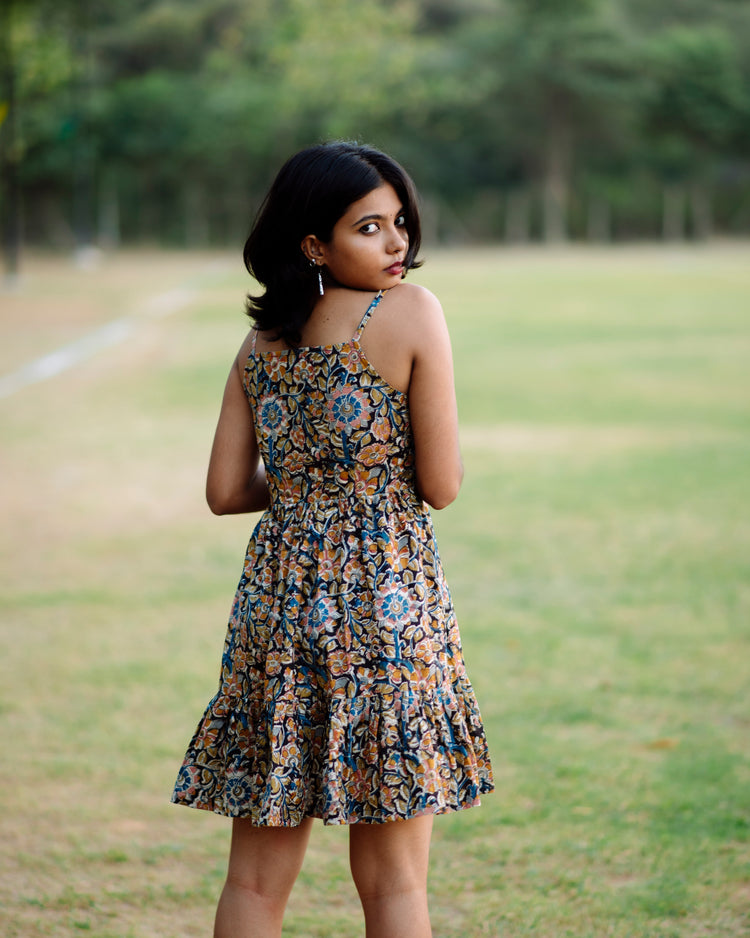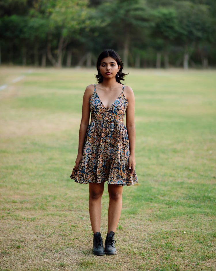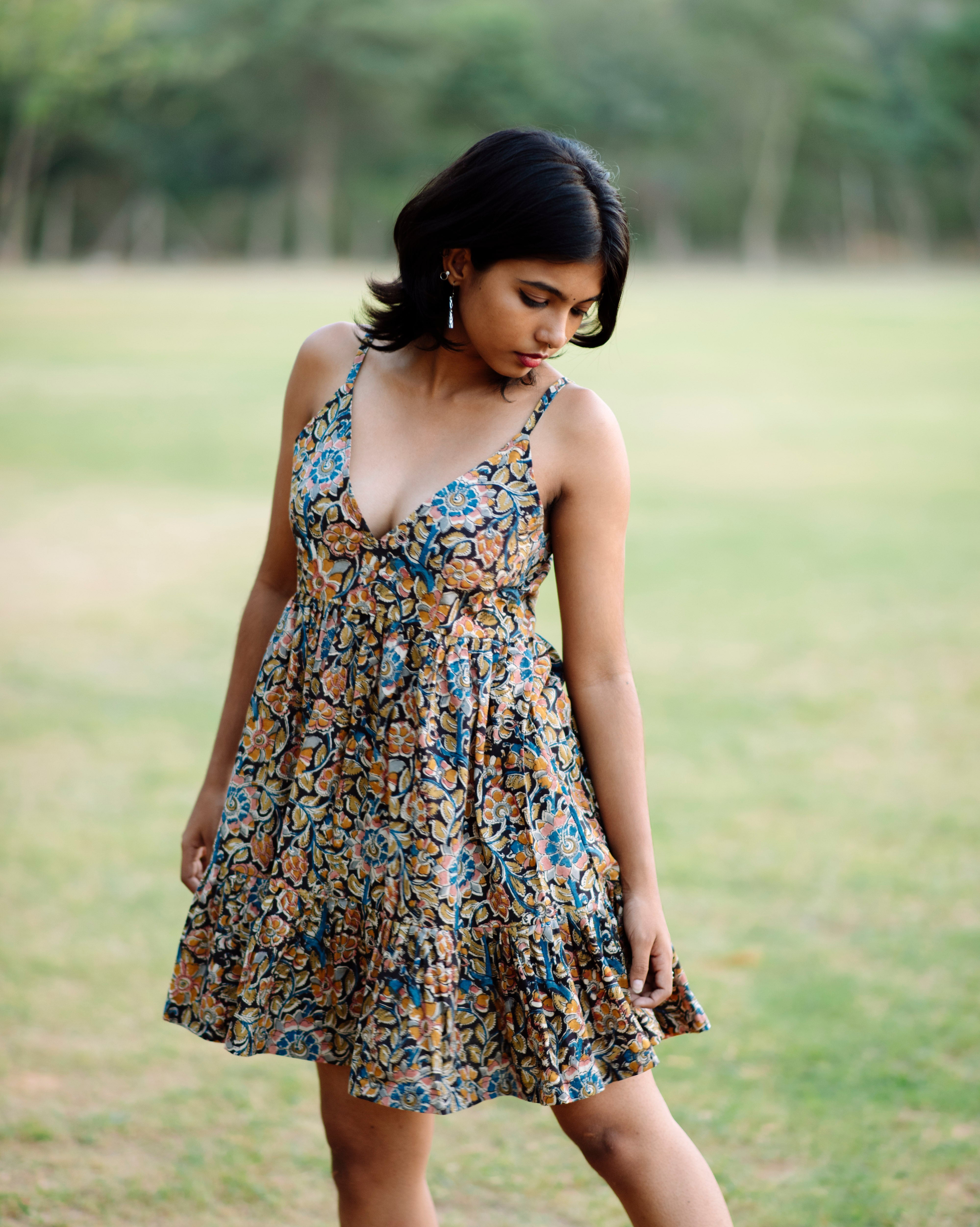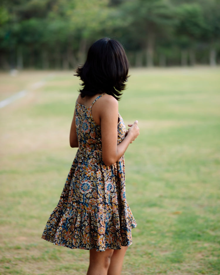 BEIGE CRAYON FLORAL BAGRU SHORT DRESS