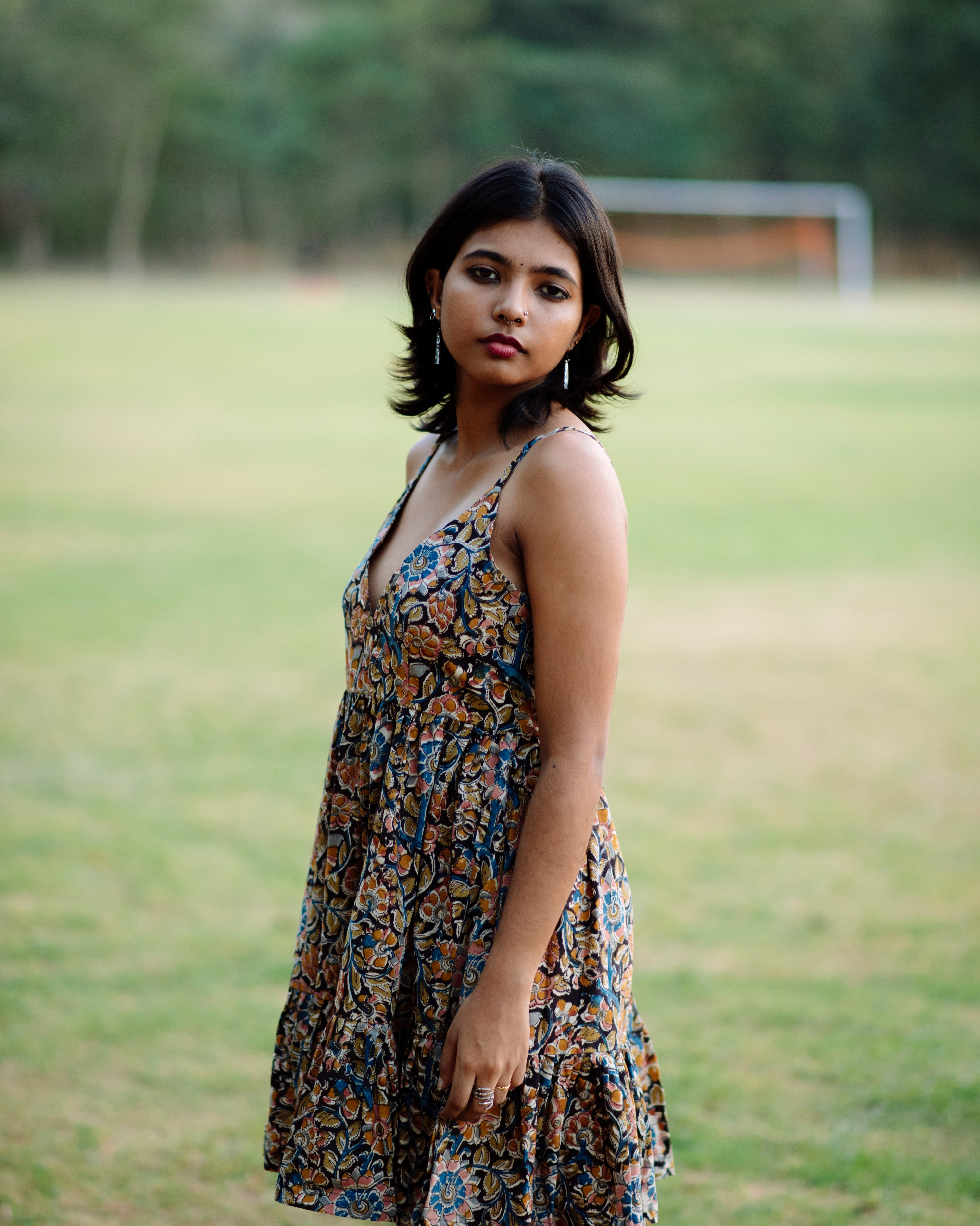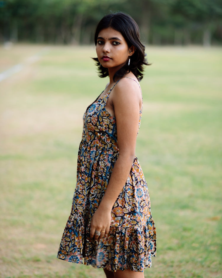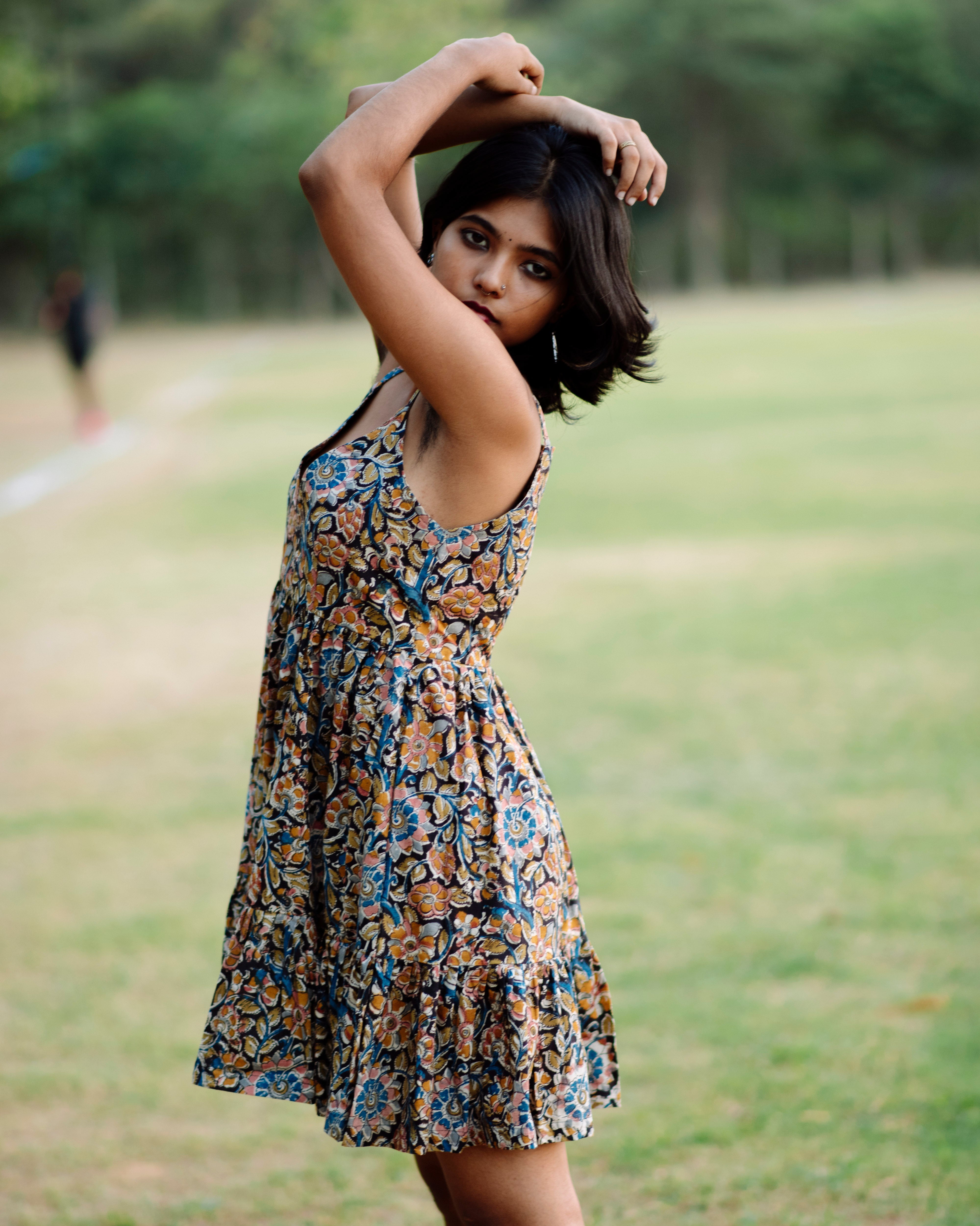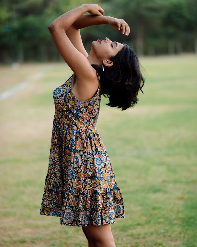 BEIGE CRAYON FLORAL BAGRU SHORT DRESS