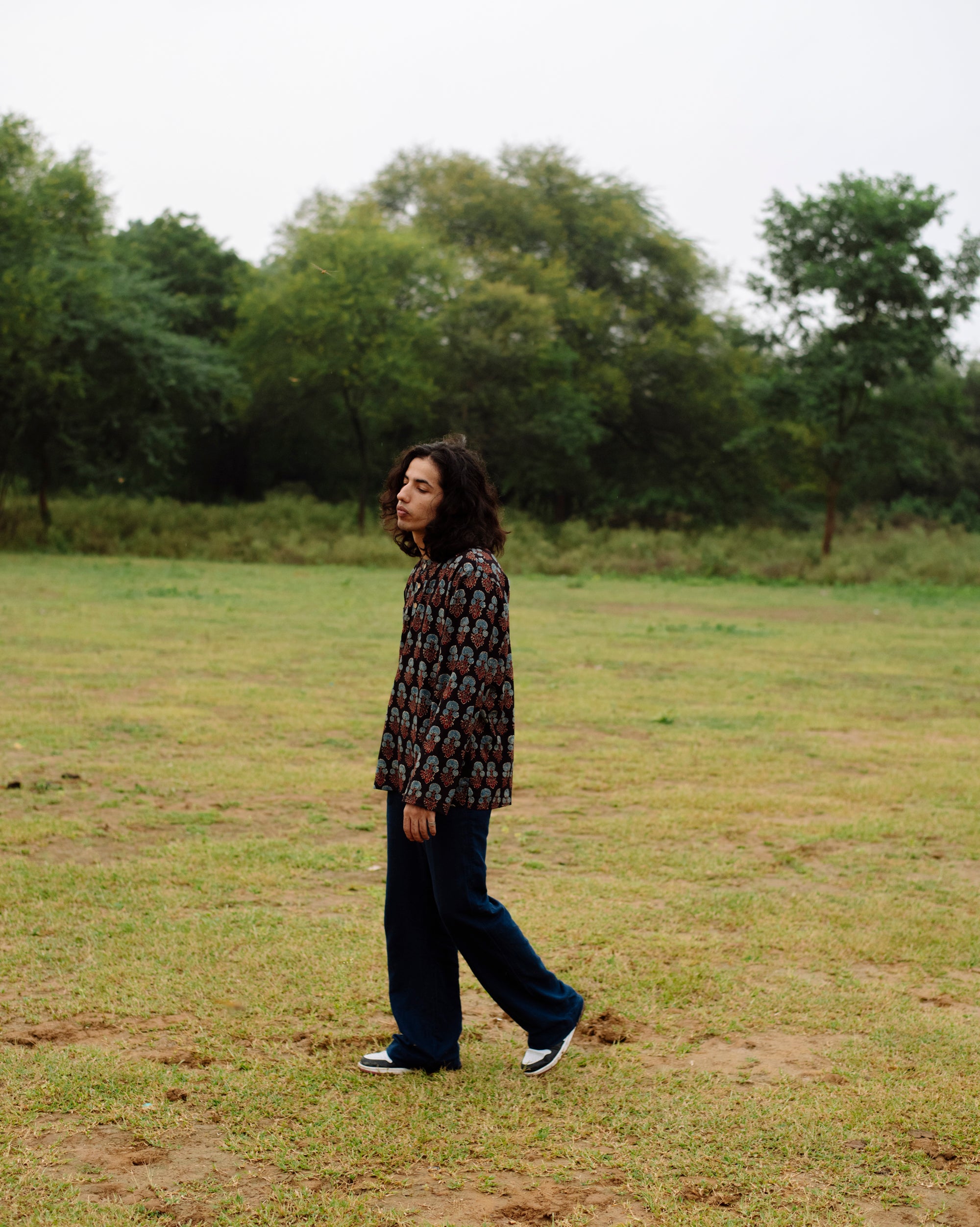 Ajrakh, an indigenous textile from India's western states, features geometric designs and patterns block printed by stamps. The procedure uses vegetables and other natural dyes to represent the history and legacy of India's historic artisan community.