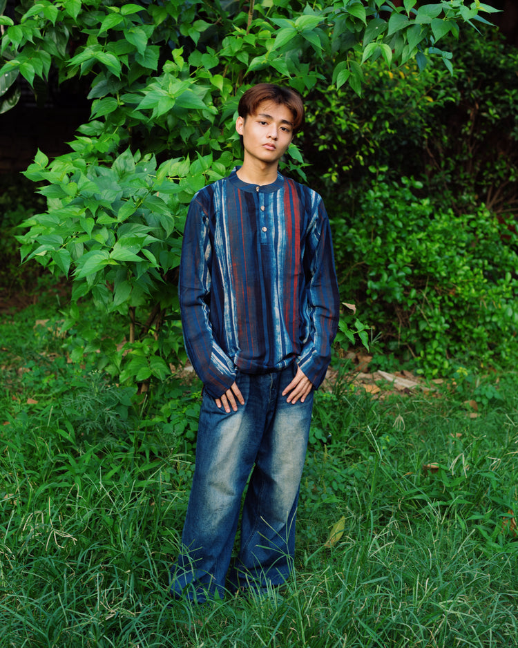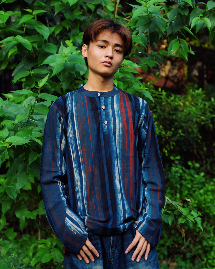 BLUE STRIPED HANDPAINTED AJRAKH SHORT KURTA