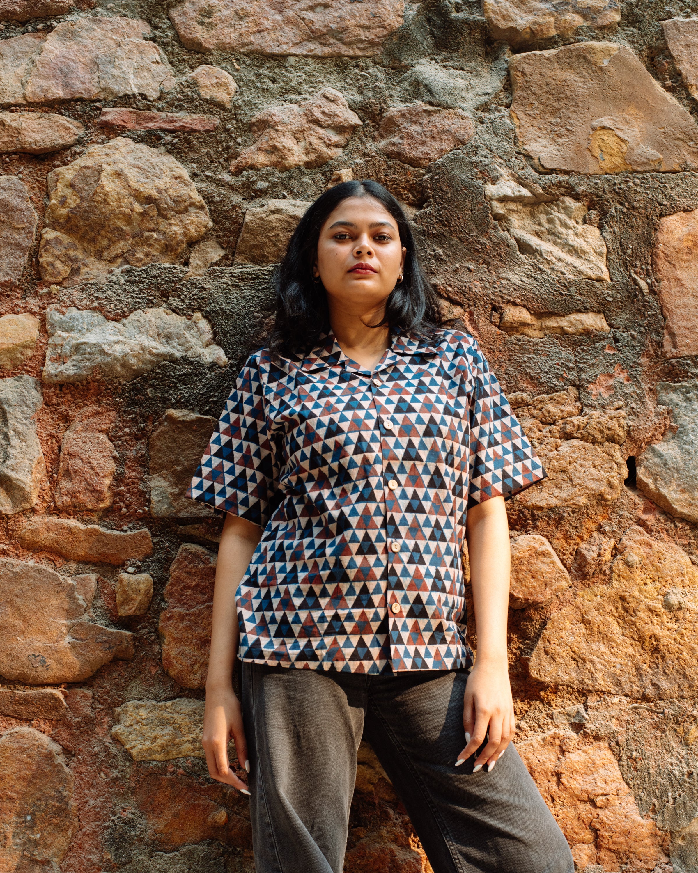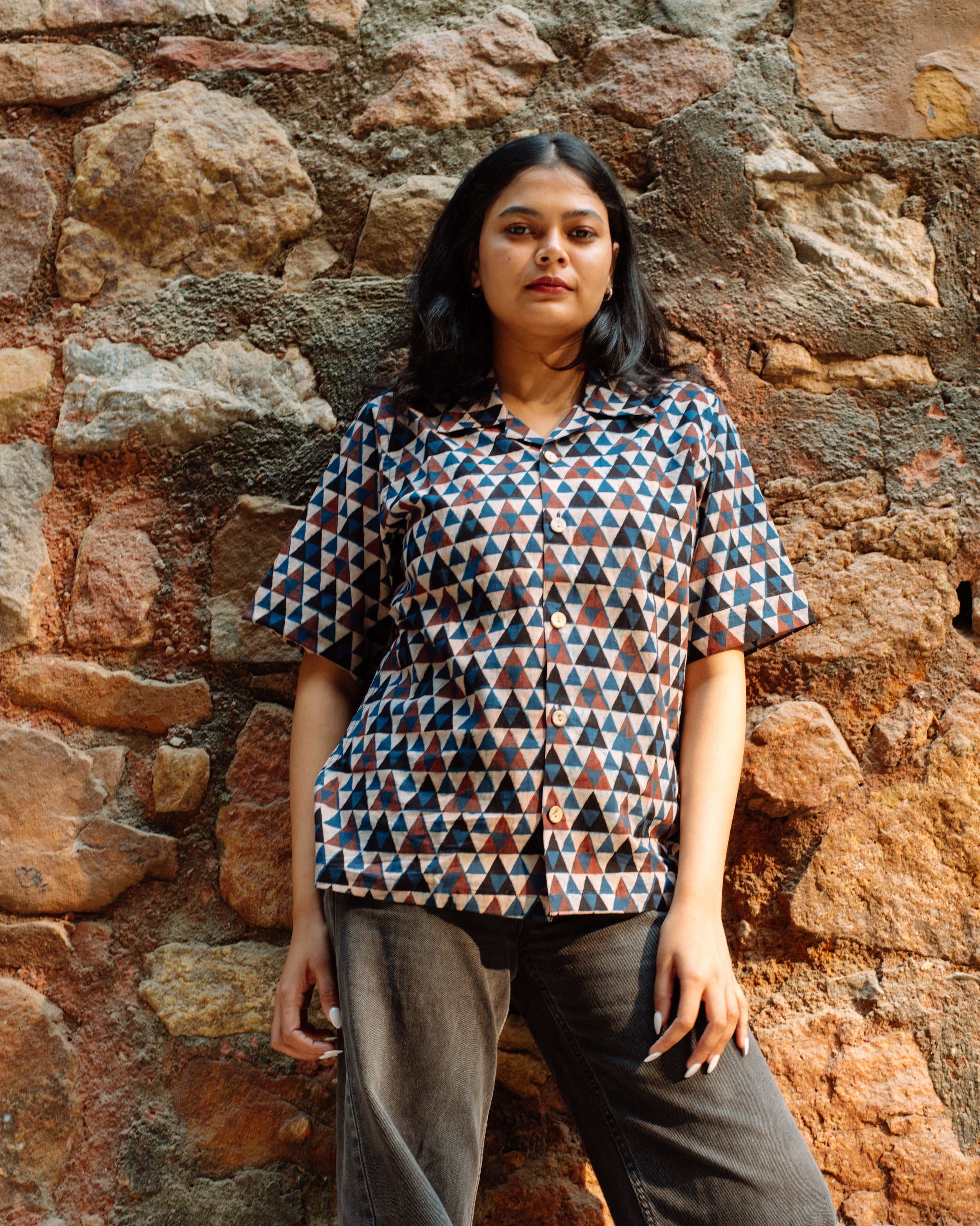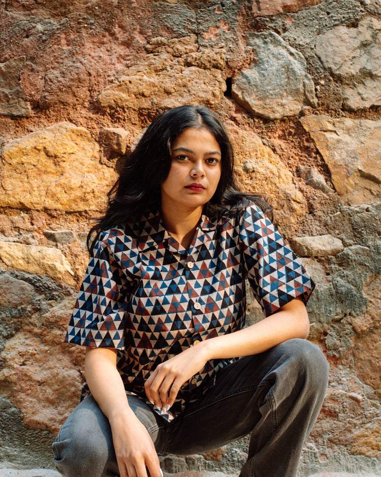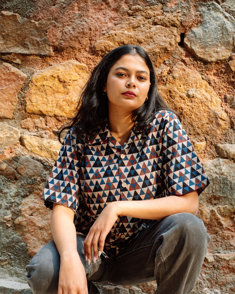 Ajrakh, an indigenous textile from India's western states, features geometric designs and patterns block printed by stamps. The procedure uses vegetables and other natural dyes to represent the history and legacy of India's historic artisan community.