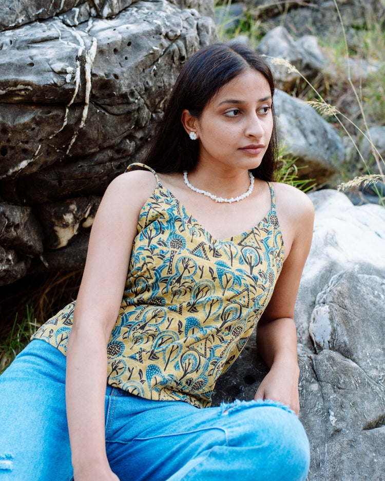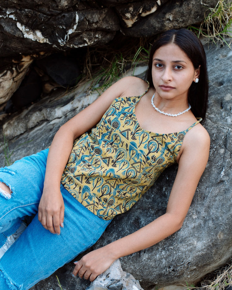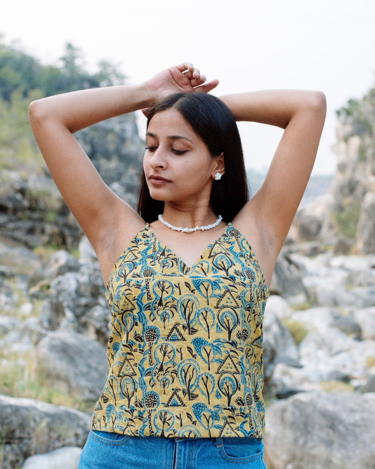 Ajrakh, an indigenous textile from India's western states, features geometric designs and patterns block printed by stamps. The procedure uses vegetables and other natural dyes to represent the history and legacy of India's historic artisan community.