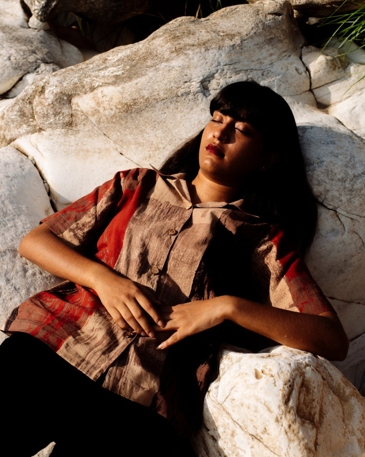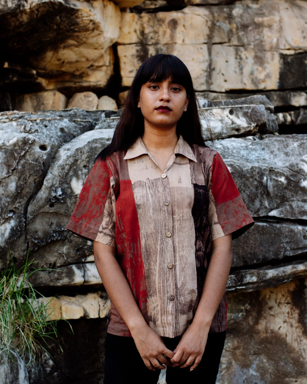 Ajrakh, an indigenous textile from India's western states, features geometric designs and patterns block printed by stamps. The procedure uses vegetables and other natural dyes to represent the history and legacy of India's historic artisan community.