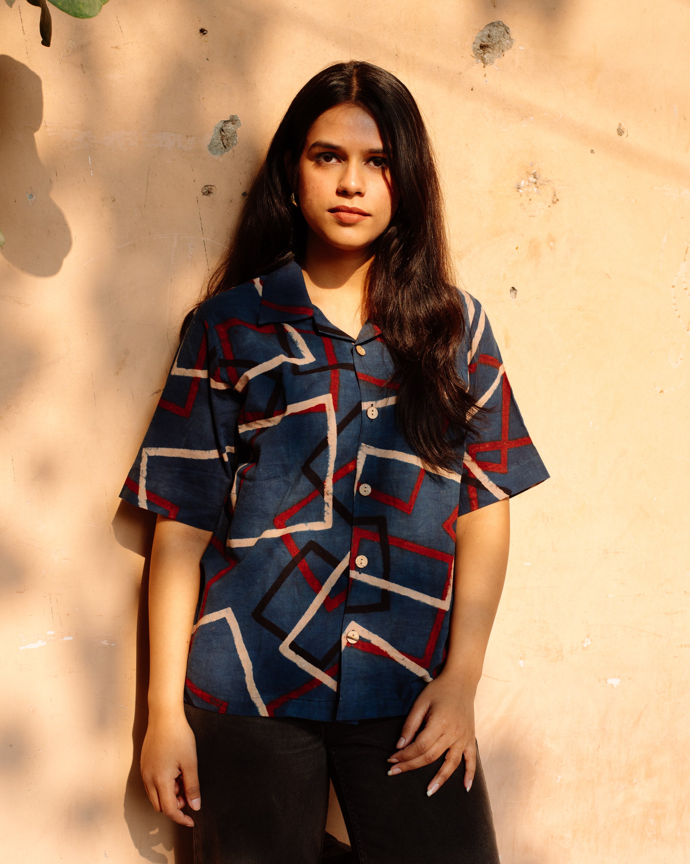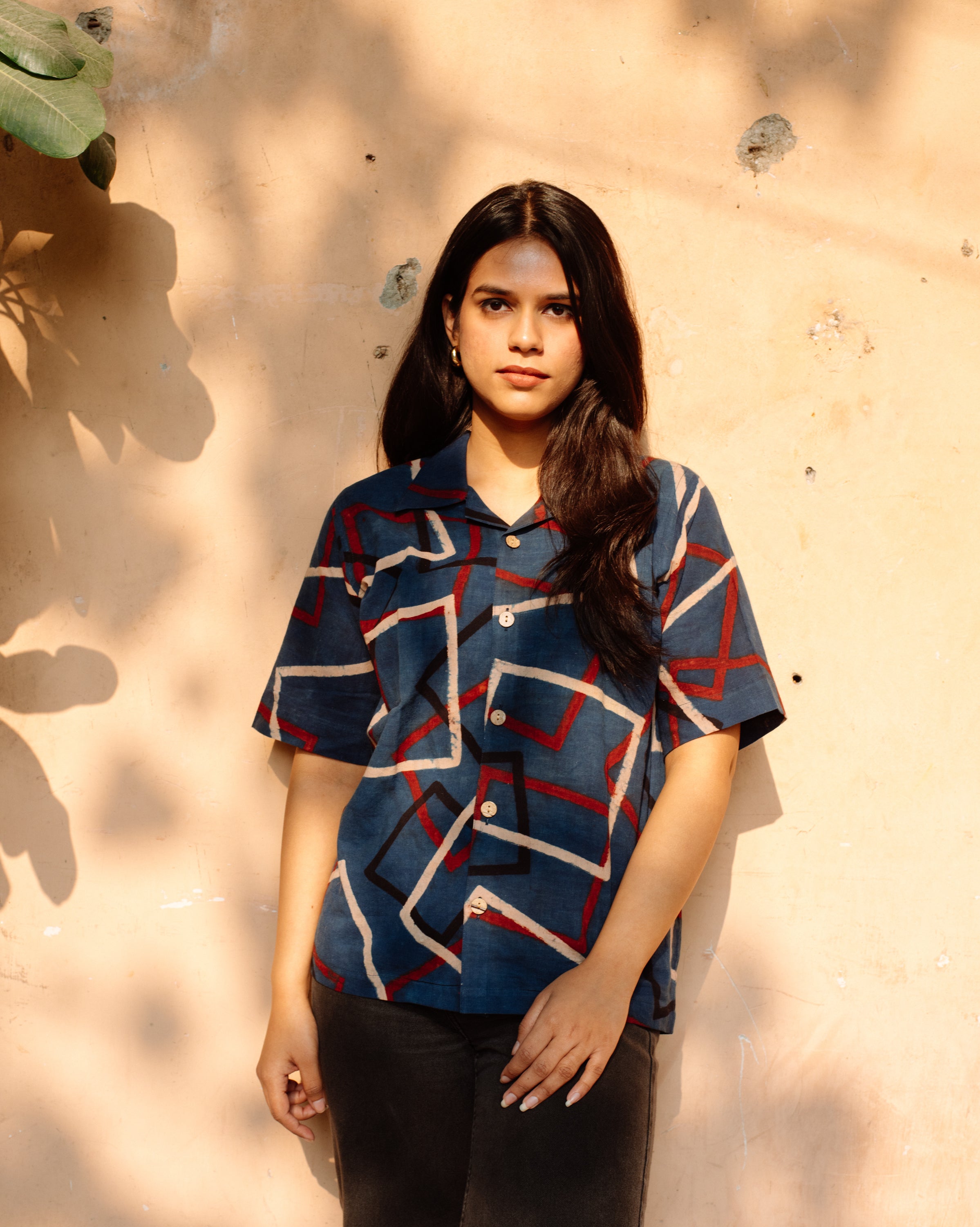 Ajrakh, an indigenous textile from India's western states, features geometric designs and patterns block printed by stamps. The procedure uses vegetables and other natural dyes to represent the history and legacy of India's historic artisan community.